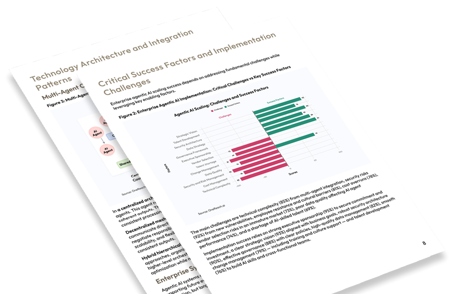 Critical Success Factors and Implementation Challenges: The main challenges are technical complexity from multi-agent integration, security risks from new vulnerabilities, employee resistance and cultural barriers, and cost overruns. Implementation success relies mainly on strong executive sponsorship, a clear strategic vision aligned with business goals, robust security architecture, effective governance with clear policies, high-quality data management, and change management.
